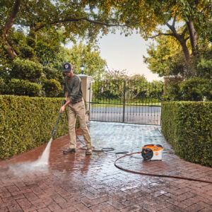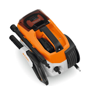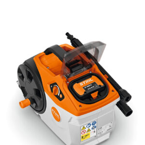 Die Stromversorgung erfolgt über einen leistungsstarken Akku aus dem STIHL AP-System. Wenn kein Wasseranschluss in der Nähe ist, können Sie im Ansaugbetrieb arbeiten und zum Beispiel das Wasser aus einer Regentonne mithilfe des optional erhältlichen Saugschlauchs nutzen. Oder Sie verwenden den als Zubehör erhältlichen praktischen Fahrwagen mit 20-l-Wassertank als autarke Wasserversorgung.